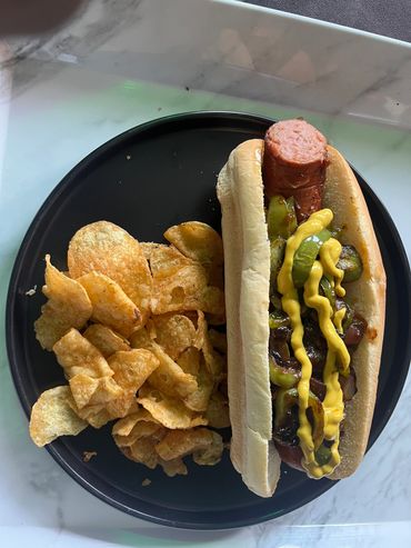 chicken Polish sausages are prepared with grilled onions, bell peppers, and mustard